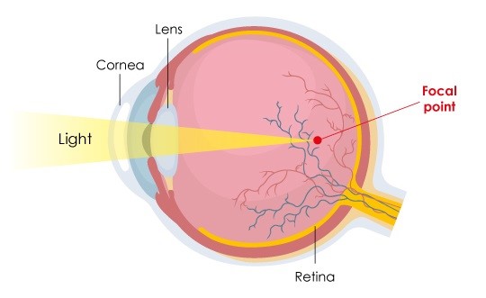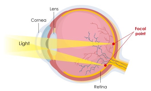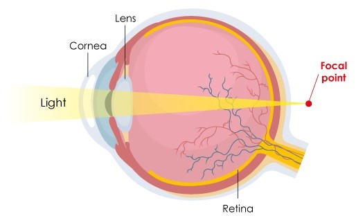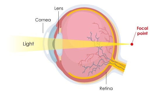 Myopia, also known as short-sightedness, is a common vision impairment where distant objects may appear blurry, while near objects are clear. Myopia occurs when the eyeball is longer than normal, resulting the light to shift its focus to the front of the retina instead of on the retina itself. Therefore, when light travels into the eyes, the light is not focused properly, thus projecting distant objects blurry. Also, myopia occurs when the cornea is too curved.